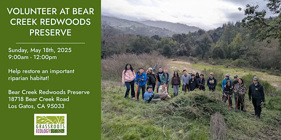 Join us at Bear Creek Redwoods Preserve, a Midpeninsula Regional Open Space Preserve, to help eradicate invasive plants and to restore habitat! Participants can expect to walk through an exposed and hilly terrain for up to 1/2 mile with 10 - 12lb tools to remove a weedy shrub known as French broom. Ticks and poison oak are common at this time of year, long pants and sleeves are highly recommended. Volunteers can also expect to see unique ecosystems of the preserve and witness wildflowers during their peak season.