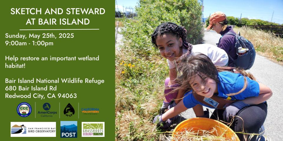 Join Grassroots Ecology, Peninsula Open Space Trust (POST), and the San Francisco Bay Bird Observatory (SFBBO) at Bair Island in the Don Edwards San Francisco Bay National Wildlife Refuge to help remove invasive plants and support Bay Area biodiversity! Participants will walk up to 0.8 miles along an exposed and often foggy Bayland levee to remove invasive Maltese thistle and crown daisy. Weather can be variable, so we highly recommend bringing layers and a refillable water bottle. Along the way, volunteers will have the chance to spot unique birds and native plants, all set against a stunning ocean backdrop — perfect inspiration for our closing nature journaling activity!
