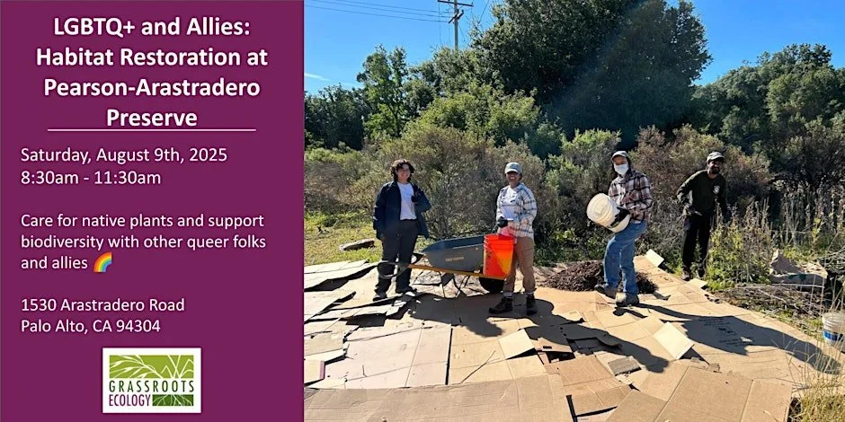 Calling all queer community members and allies! Volunteer with Grassroots Ecology to support the riparian ecosystems and floodplains at Pearson-Arastradero Preserve. These ecosystems are home to an abundance of wildlife, including deer, bobcats, coyotes, many species of birds and insects, and more! During our time together, volunteers will use buckets to water native plants, and to add mulch to restoration areas.