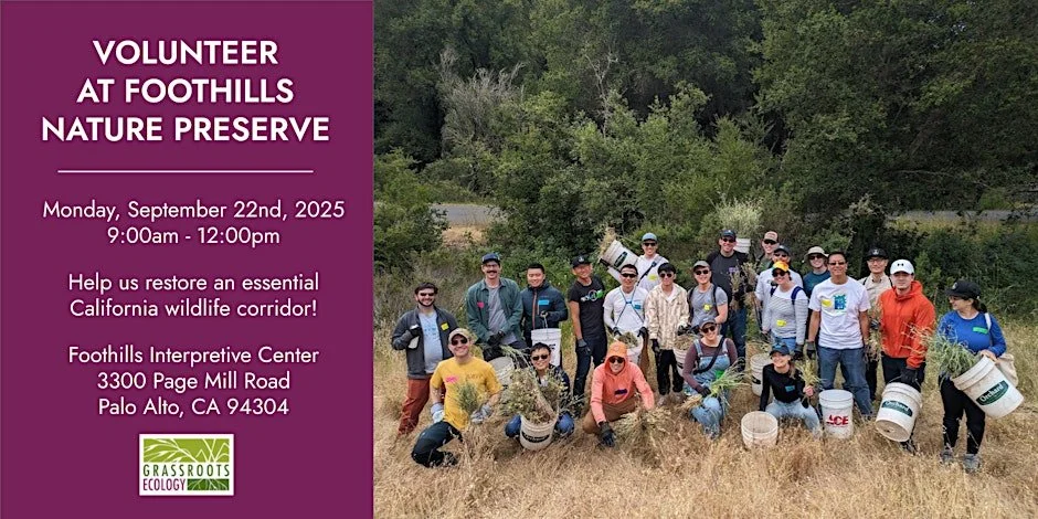 Parking: Meet at Foothills Nature Preserve Interpretive Center at 3300 Page Mill Rd, Palo Alto 94304. Please carpool if possible. The road up to the site is very steep and curvy. Download driving instructions ahead of time, as there is limited cell reception up on Page Mill Rd. There will be a ranger at the park entrance, and volunteers will receive entry details in their confirmation email.