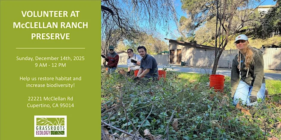 Join Grassroots Ecology in our ongoing restoration of habitat along Stevens Creek at McClellan Ranch Preserve in Cupertino! We will spend our time together removing invasive plants. Volunteers should expect to walk off trail on uneven ground, kneel or sit on kneeling pads, use hand tools and body tools, and carry buckets.