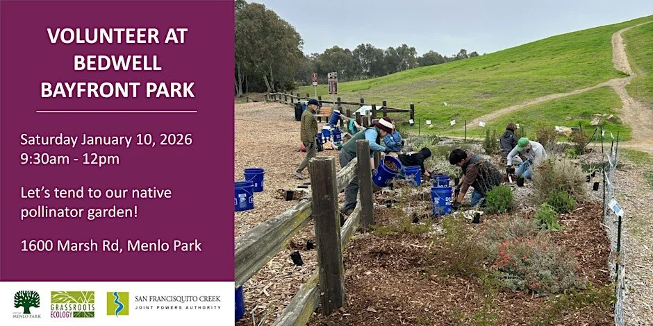 Come join us to work on a project funded by Measure AA to tend a pollinator garden that will sustain a small ecosystem at Bedwell Bayfront Park. During our time together, we will be planting native plants, watering, and adding mulch to our garden area to support local pollinator populations.