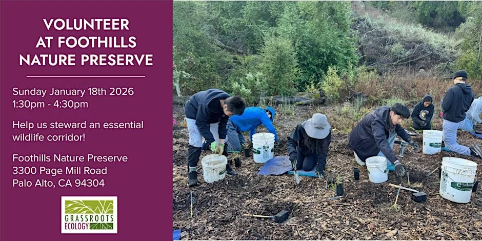 Parking: Meet at the Interpretive Center within Foothills Nature Preserve, 3300 Page Mill Rd, Palo Alto 94304. Please carpool if possible. The road up to the site is very steep and curvy. Download driving instructions ahead of time, as there is limited cell reception up on Page Mill Rd. There will be a ranger at the park entrance, and volunteers will receive entry details in a reminder email.