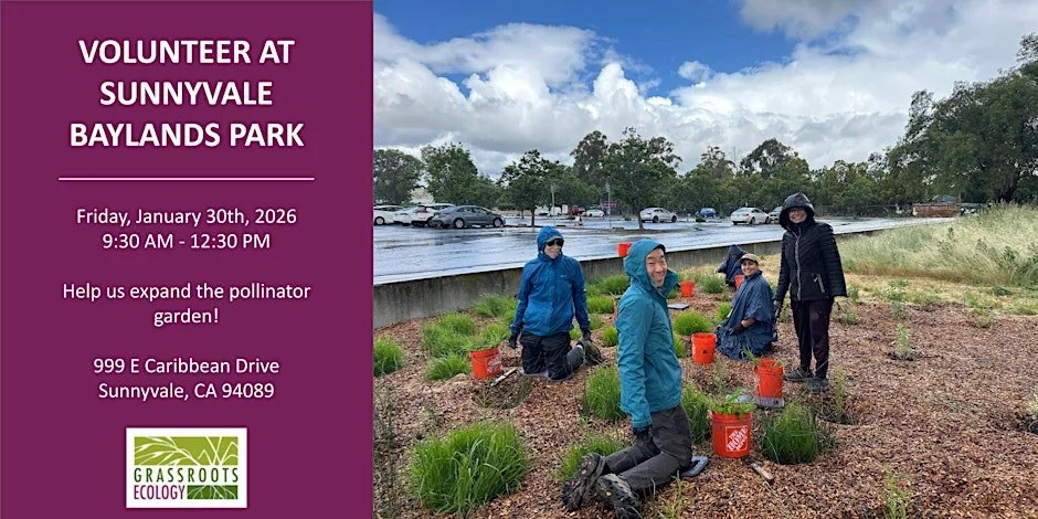 Join Grassroots Ecology in planting the pollinator garden at Sunnyvale Baylands Park! We will spend our time together installing and caring for native plants. Volunteers should expect to sit or kneel on kneeling pads, use hand tools to dig, and carry small buckets of water.