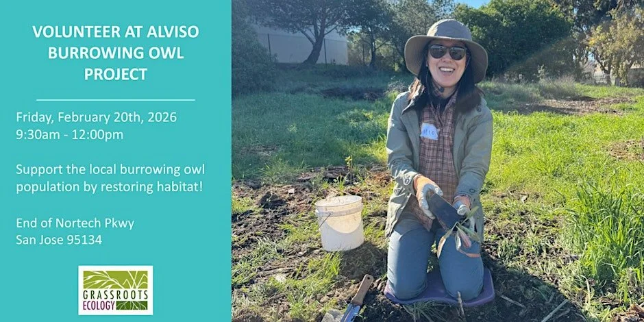 Parking information: Navigate to 150 Nortech Pkwy, San Jose, CA 95134, the closest address to the project site. The site is not open to the public because it is sensitive habitat for burrowing owls. Access will be provided through the large metal gates at the end of the road - there will be a sign for the event. Park inside the gates of the project site along the unpaved road. View the parking map posted below. The gate will be locked at 9:45am; please arrive on time.