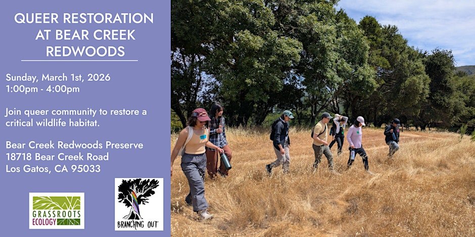 Celebrate Pride Outside! Join Grassroots Ecology and Branching Out Adventures at Bear Creek Redwoods Preserve, a Midpeninsula Regional Open Space Preserve, to help remove invasive plants and restore habitat! Participants can expect to walk through an exposed and hilly terrain for up to 1 mile with 10 to 12 lb tools to remove a weedy shrub called French broom.