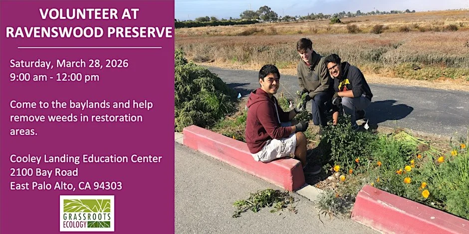 Join Grassroots Ecology at Ravenswood Open Space Preserve for a morning of habitat restoration, no prior experience required! We'll be removing invasive plants from the preserve to improve habitat and to give our native plants support. Our work area will be a 1.5 mile round trip from our meeting area. Volunteers can expect to work on a gentle slope, this includes having their backs bent over for long periods and the use of gardening tools.