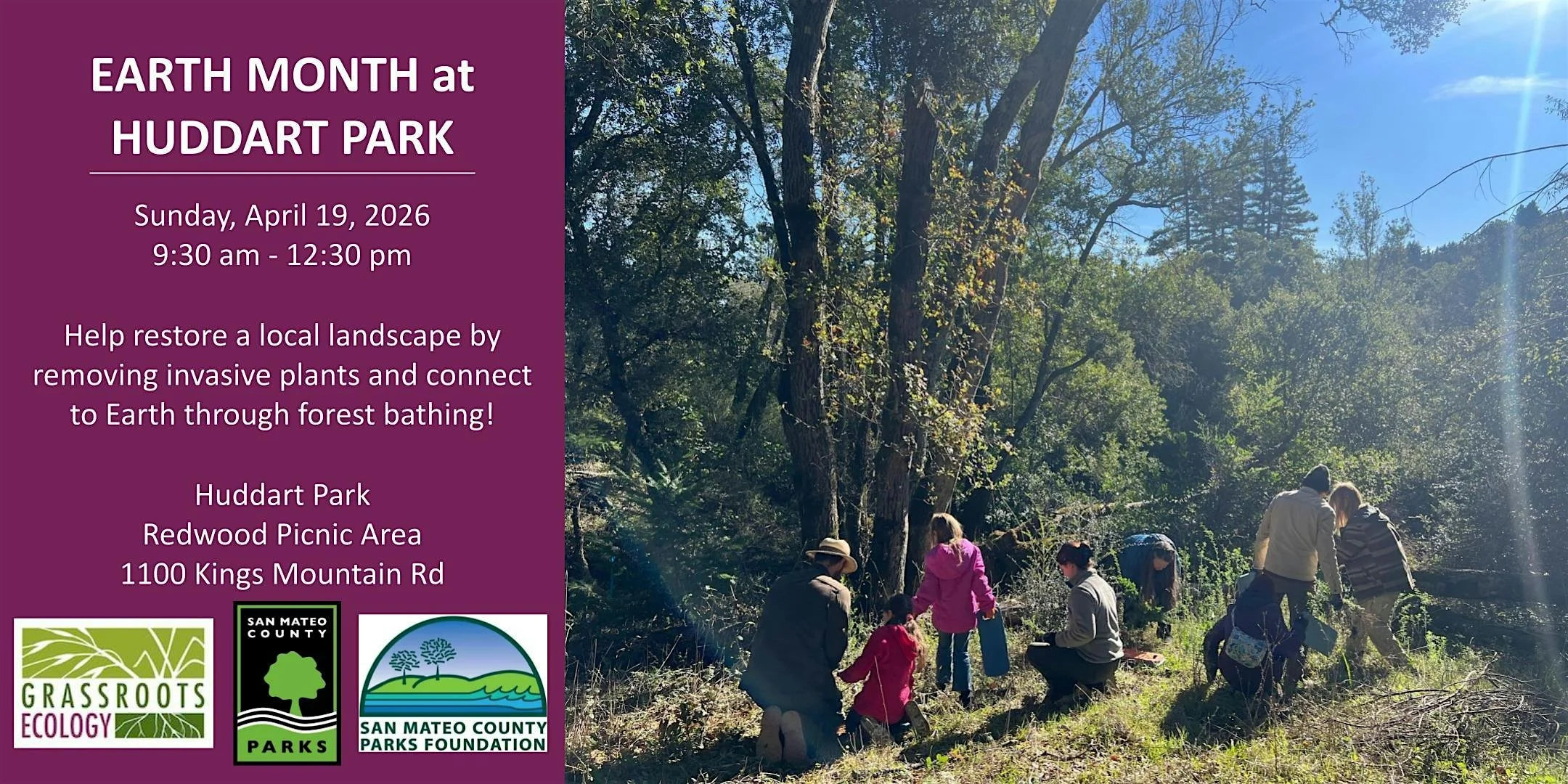 Transportation for Huddart Park: The best way to get to the park is by personal cars as there is no public transportation to Huddart Park. Please carpool if possible. The road up to the park is steep and curvy. Download driving instructions ahead of time, as there is limited cell reception up on Kings Mountain Rd. A ranger will be at the park entrance, and volunteers will receive entry details in a reminder email. Please account for driving through the park and parking to take 10 to 15 minutes.