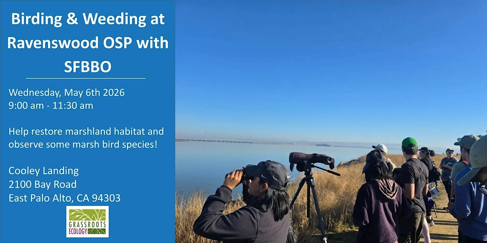 ¡Únete a Grassroots Ecology y San Francisco Bay Bird Observatory ¡No se requiere experiencia previa! Trabajaremos para mejorar nuestras áreas de restauración de hábitats eliminando las plantas invasoras, para apoyar al ecosistema. Los voluntarios pueden anticipar trabajar en tierra plana, esto incluye tener la espalda doblada por periodos largos o sentarse en el suelo, y usar herramientas de jardinería. Después, vamos por una caminata de observación de aves guiada por nuestros amigos de SFBBO.