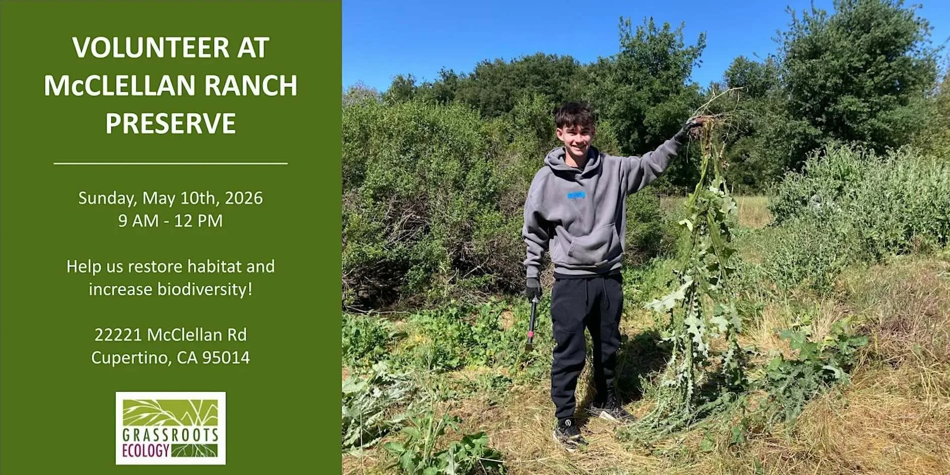 Join Grassroots Ecology in our ongoing restoration of habitat in the meadow at McClellan Ranch Preserve in Cupertino! We will spend our time together weeding invasive plants like thistle and mustard. Volunteers should expect to walk off trail on uneven ground, kneel or sit on kneeling pads, use hand tools and body tools, and carry buckets.