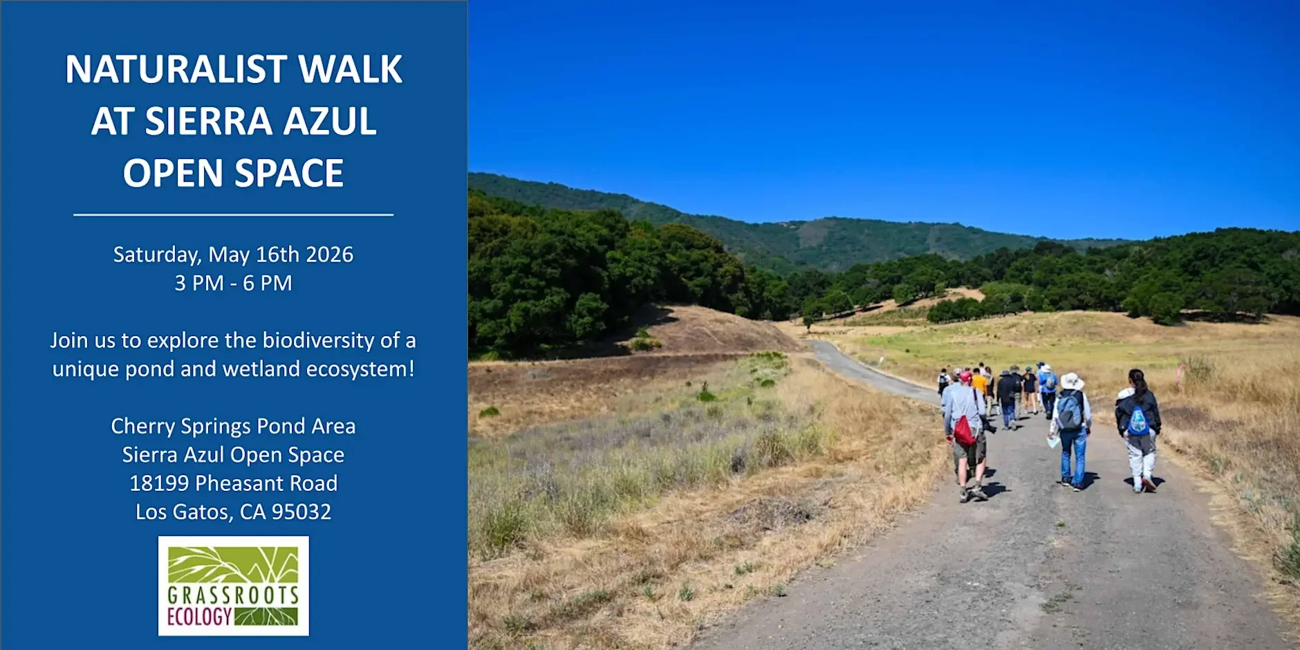 Directions and Parking: We will be meeting at Cherry Springs Pond at the end of Pheasant Road in Los Gatos. Download driving instructions ahead of time, as there is limited cell reception. The preserve entry requires driving on a private road into the preserve. Please note while the road is paved, there are some sections with potholes. Vehicles may get dirty and/or dusty. Please navigate to 18199 Pheasant Rd or 37.20222, -121.9078 for accurate directions to our meeting point. Follow Grassroots Ecology signs for where to meet and park.