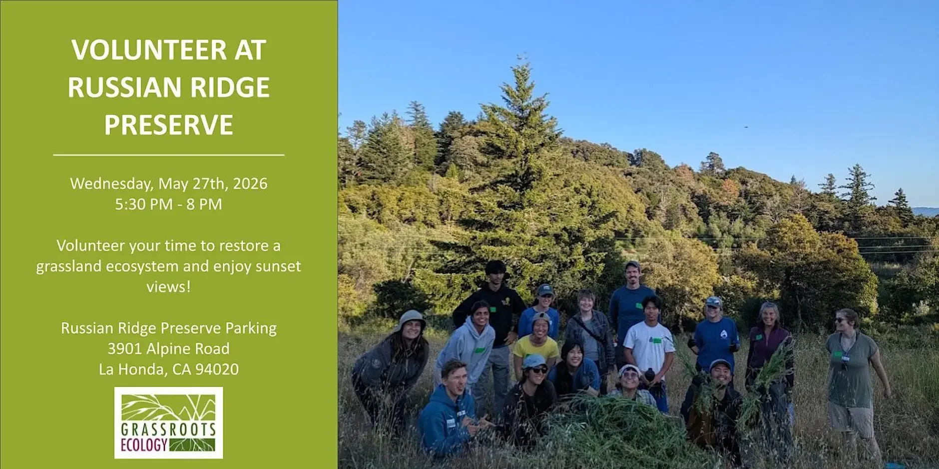 Join Grassroots Ecology at Russian Ridge Open Space, a Midpeninsula Regional Open Space Preserve, to help restore wildlife habitat to this essential grassland ecosystem and remove invasive plants! Volunteers can expect to use small hand held tools, buckets, and gloves to weed spiny invasive plants at their smooth base. Volunteers can also expect a walk to learn about California ecology with spectacular views of the San Francisco Bay. Visit Grassroots Ecology's Midpen Preserves page to learn more about the ecosystem and accessibility considerations.