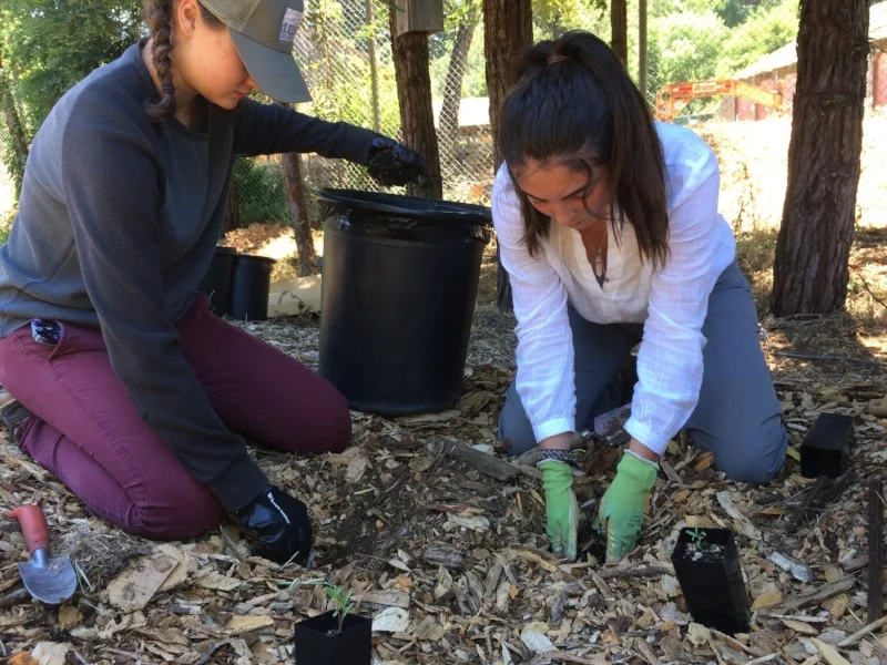 Interns planting native species in the demonstration garden of Grassroots Ecology's nursery.