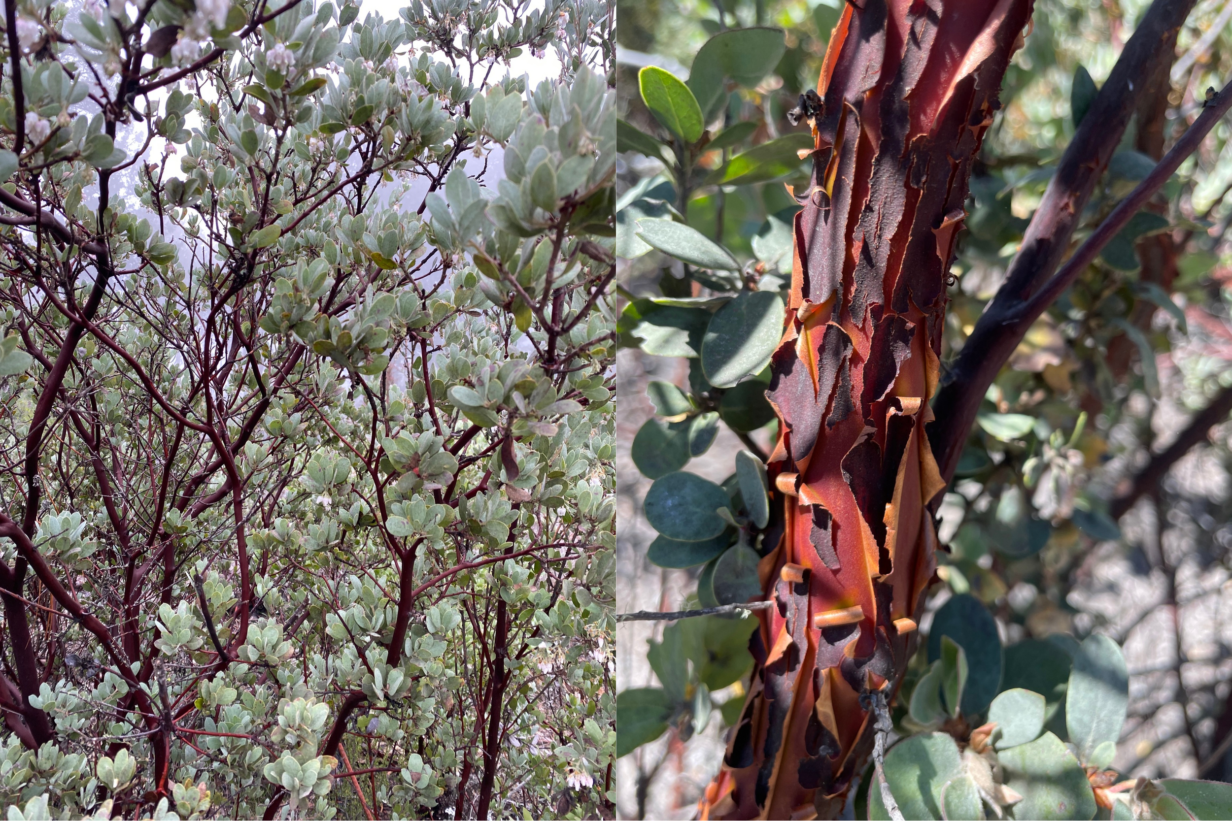 Fully grown silverleaf manzanita can appear more tree-like than shrubby. Each year old bark will peel, making way for new bark.