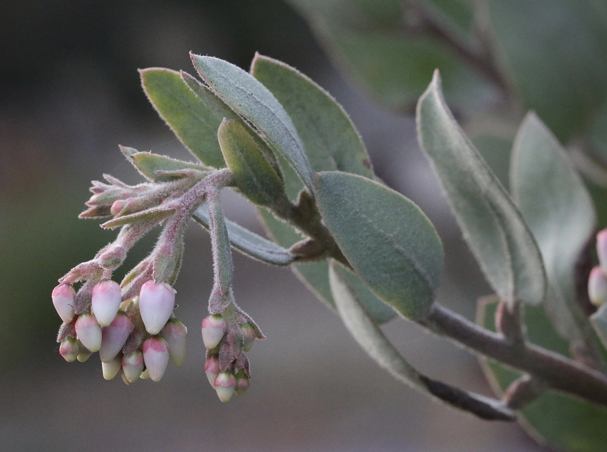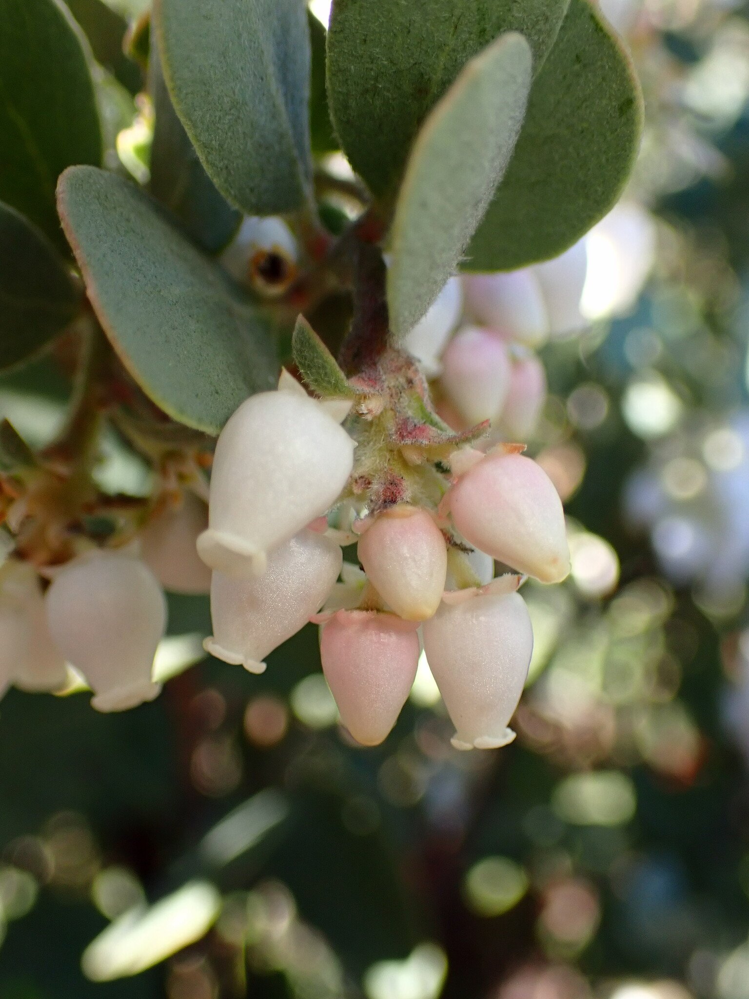 Silverleaf manzanita is an upright to mounding evergreen shrub (with its iconic gray-green foliage, one could call it evergray) that can grow to be 3-16 ft tall. often resembling more of a tree with age. The bark is dark red, smooth, and depending on the time of the year can be peeling. The pink-to-white urn shaped flowers are held in panicles (loosely branched clusters of flowers) which have bell-shaped reflexed bracts (leaf-like structures bent backward from the flowers). The fruits are large (6-12 mm wide) and smooth with no hairs.