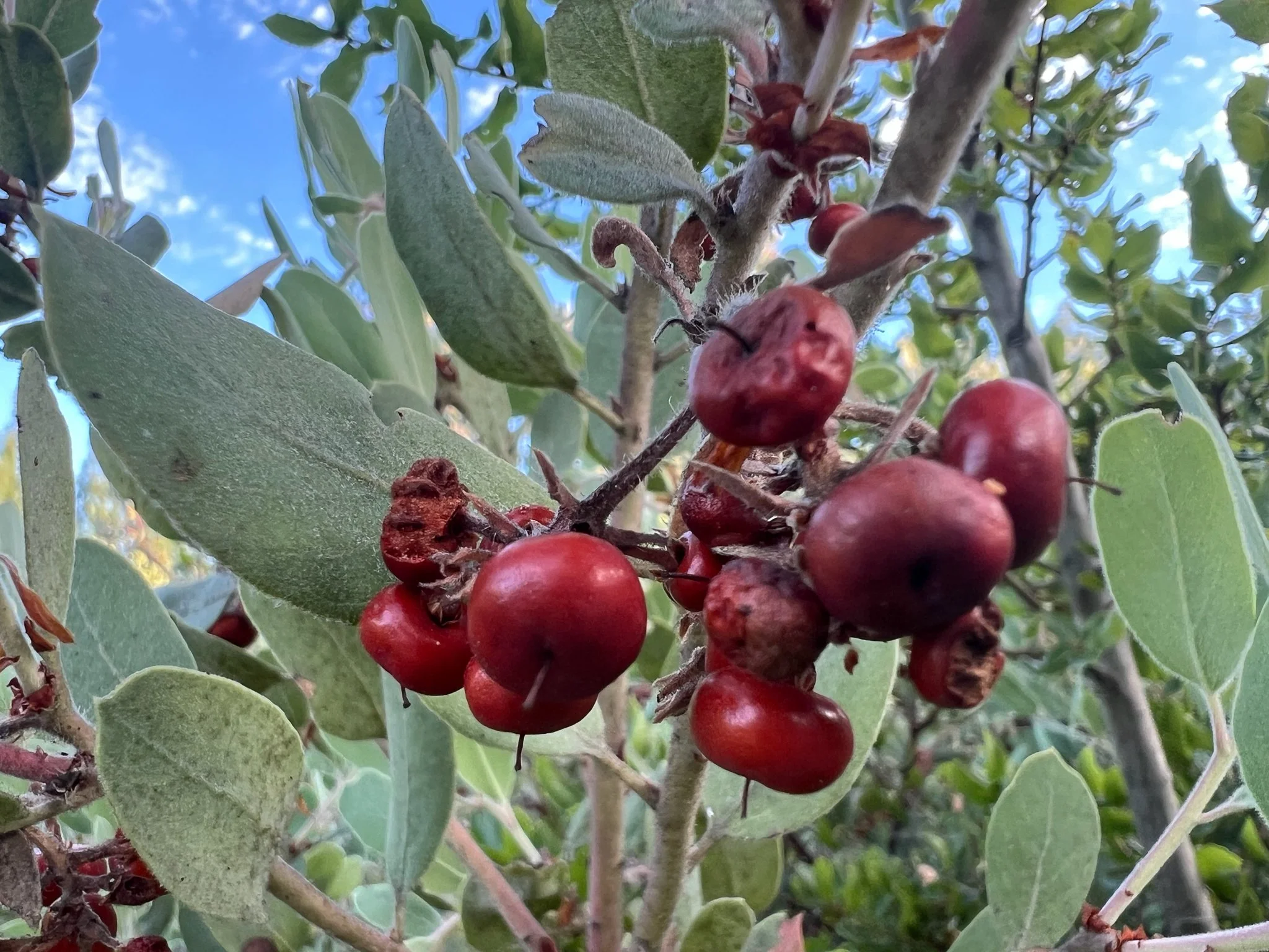 Silverleaf manzanita, also known as Bonny Doon manzanita (Arctostaphylos silvicola), only occurs naturally in the sandhills of the southern Santa Cruz Mountains in Santa Cruz and Santa Clara counties. It gets its name from its small red fruits (manzanita means “little apple” in Spanish) and its fuzzy, silver-green foliage.